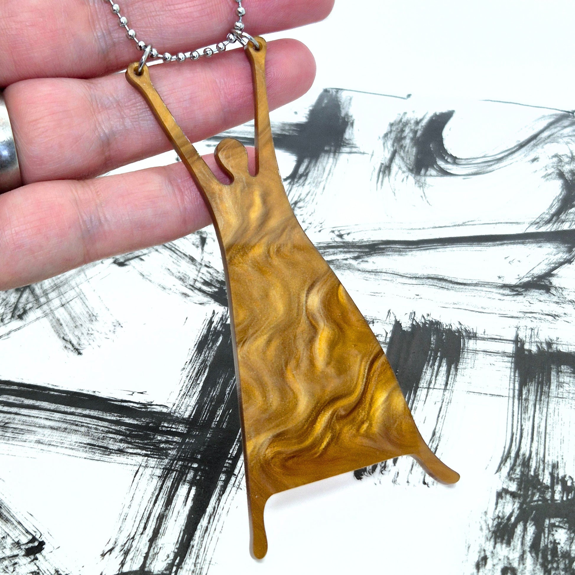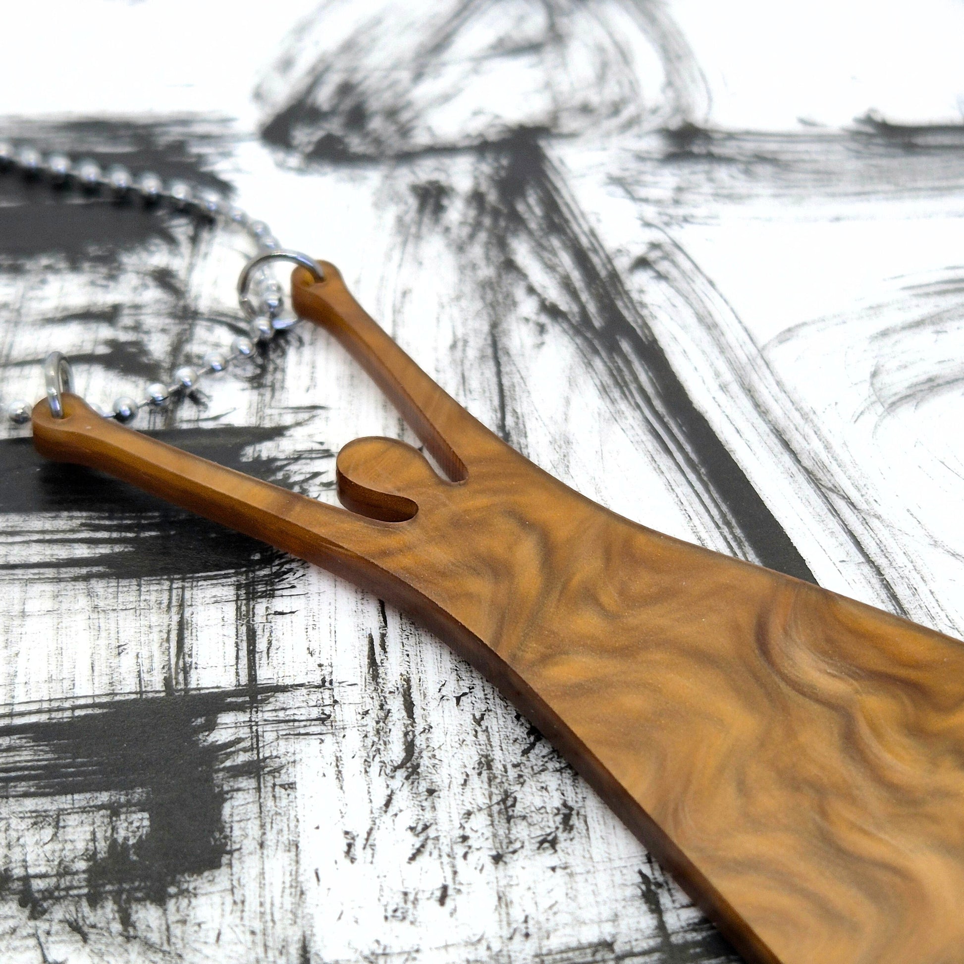 Kaxigt och färgstarkt halsband i laserskuren akryl, som har underbar levande marmoryta i en varm brun. Hänget har en blank yta och hänger i en lång kulkedja.