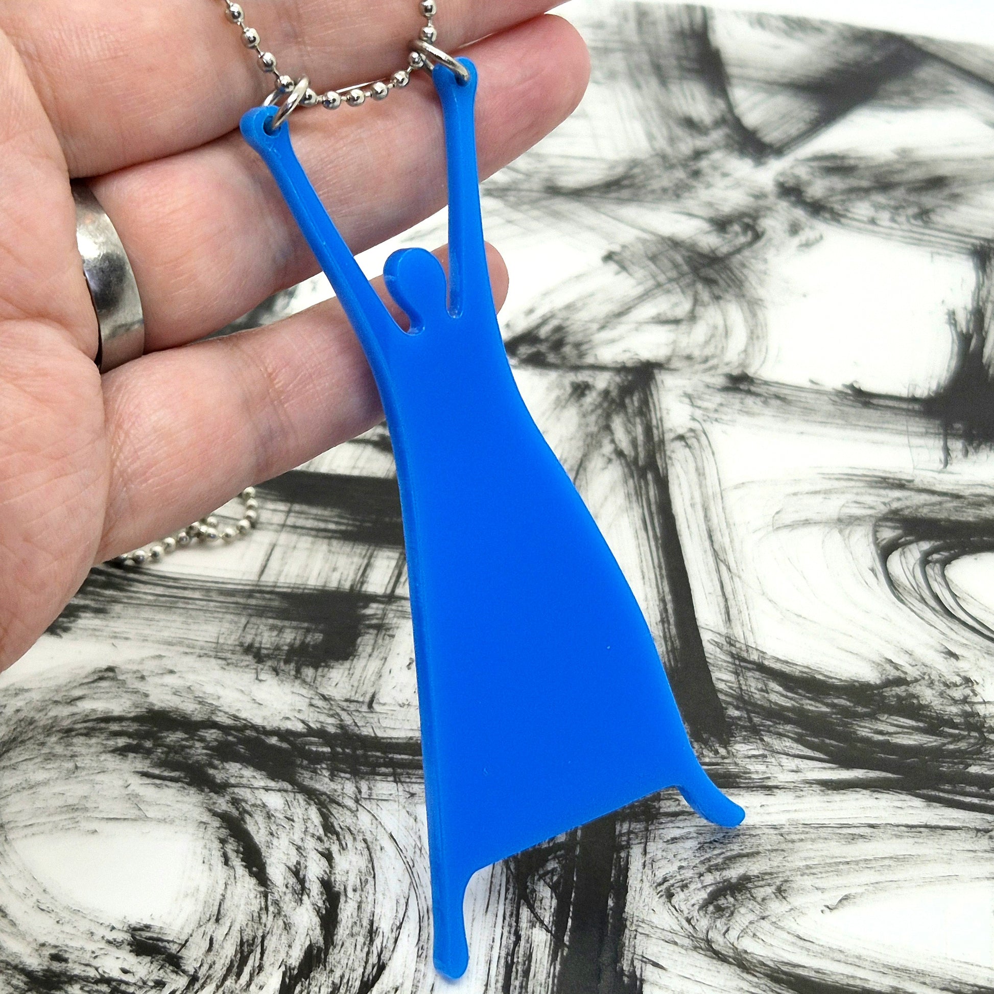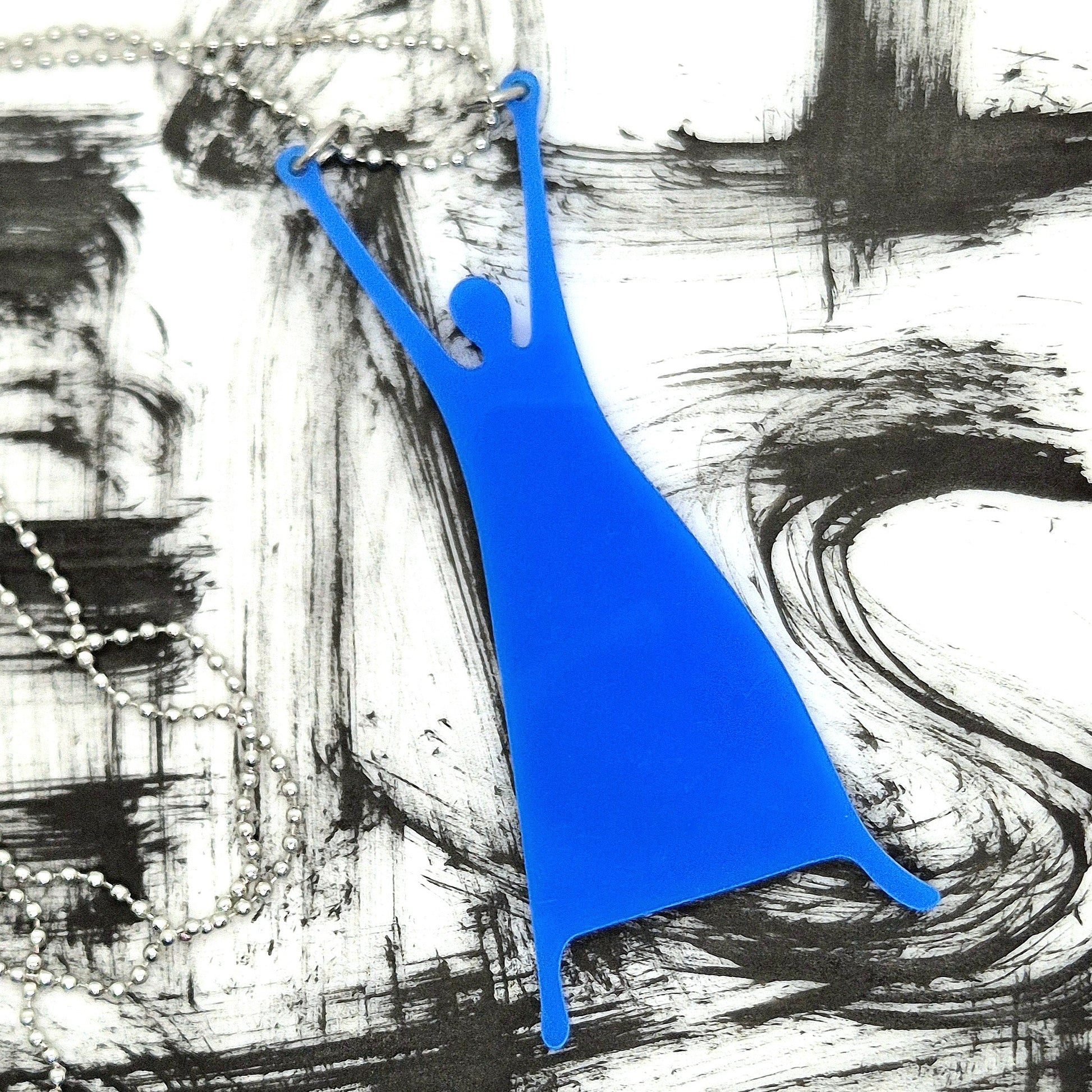 Kaxigt och färgstarkt halsband i laserskuren akryl. Färgen är härligt klar blå, i en nyans någonstans mellan intensiv himmelsblå och klassisk legoblå. Hänget har en blank yta och hänger i en lång kulkedja.