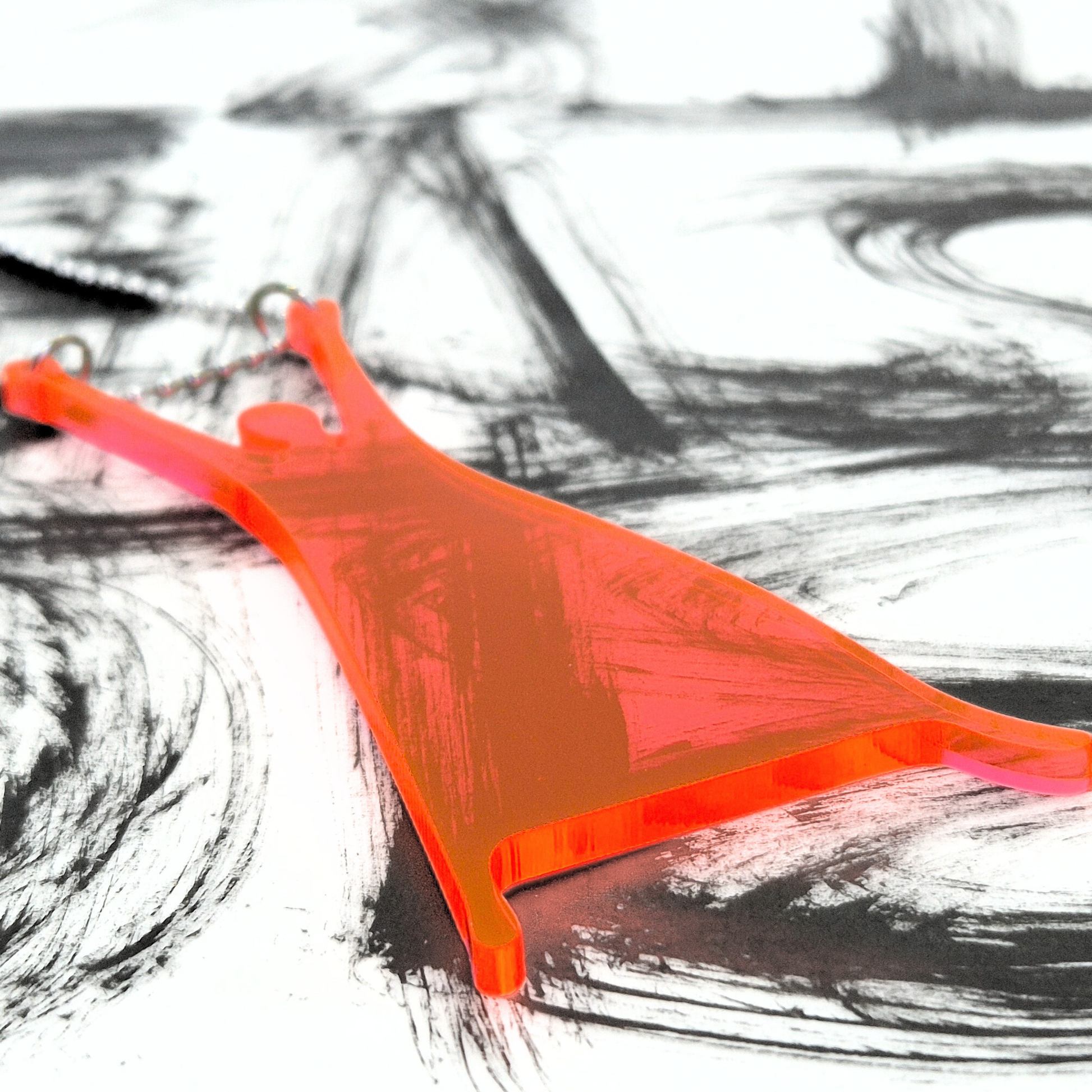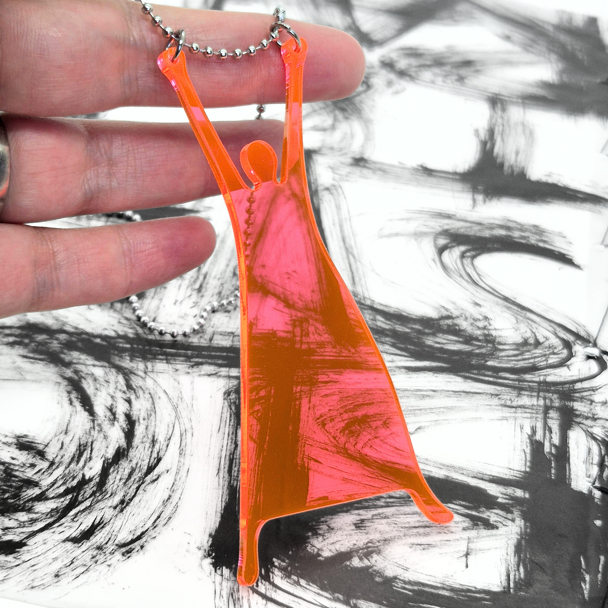 Kaxigt och färgstarkt halsband i laserskuren akryl. Styrka, kraft och glädje i en varm neonrosa akryl som är transparent och självlysande. Hänget har blank yta och hänger i en lång kulkedja.
