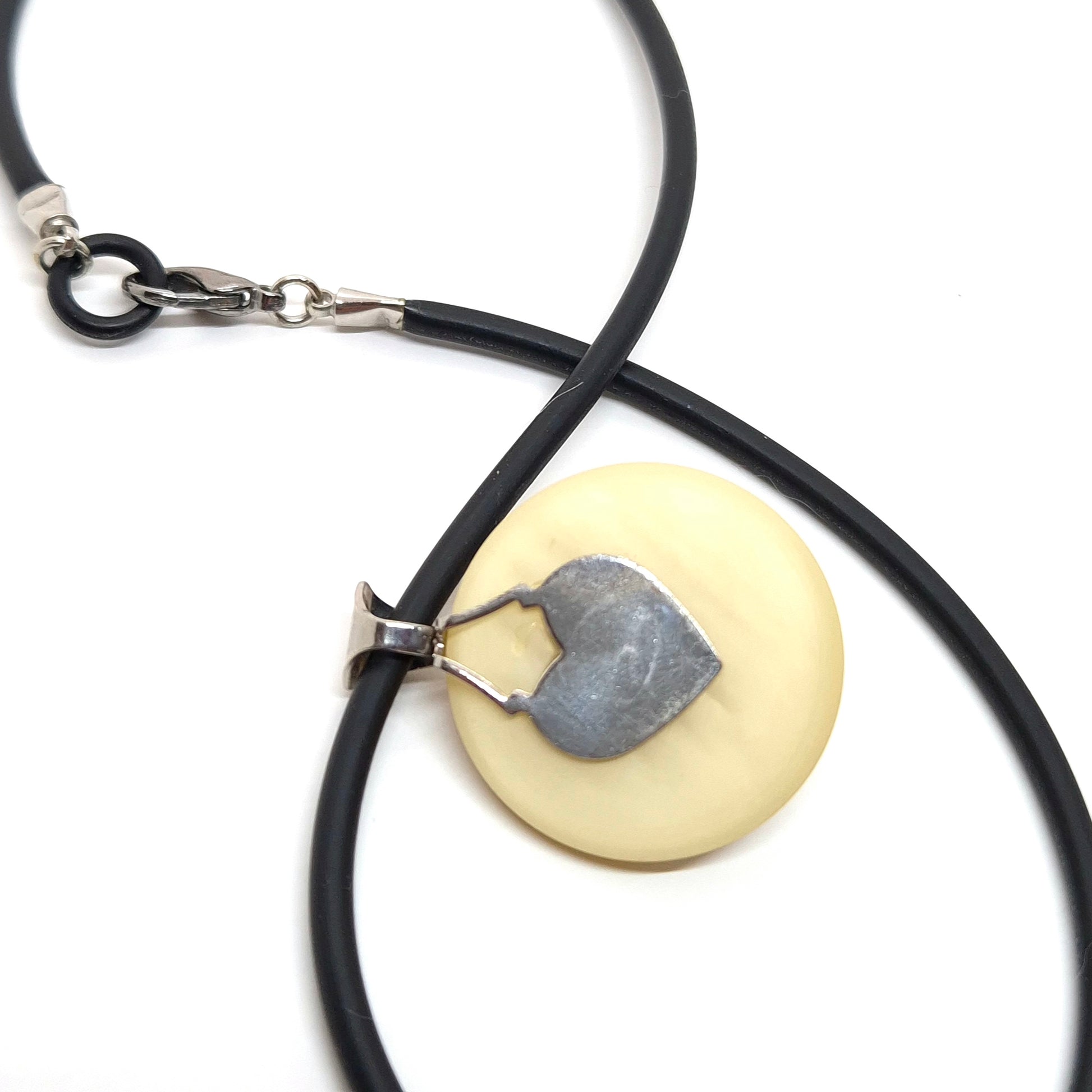 Kaxigt halsband med hänge av tre vintageknappar. En varmt benvit i botten, en rostig gulorange och ensvart kula på toppen. Halslänk av svart gummi.
