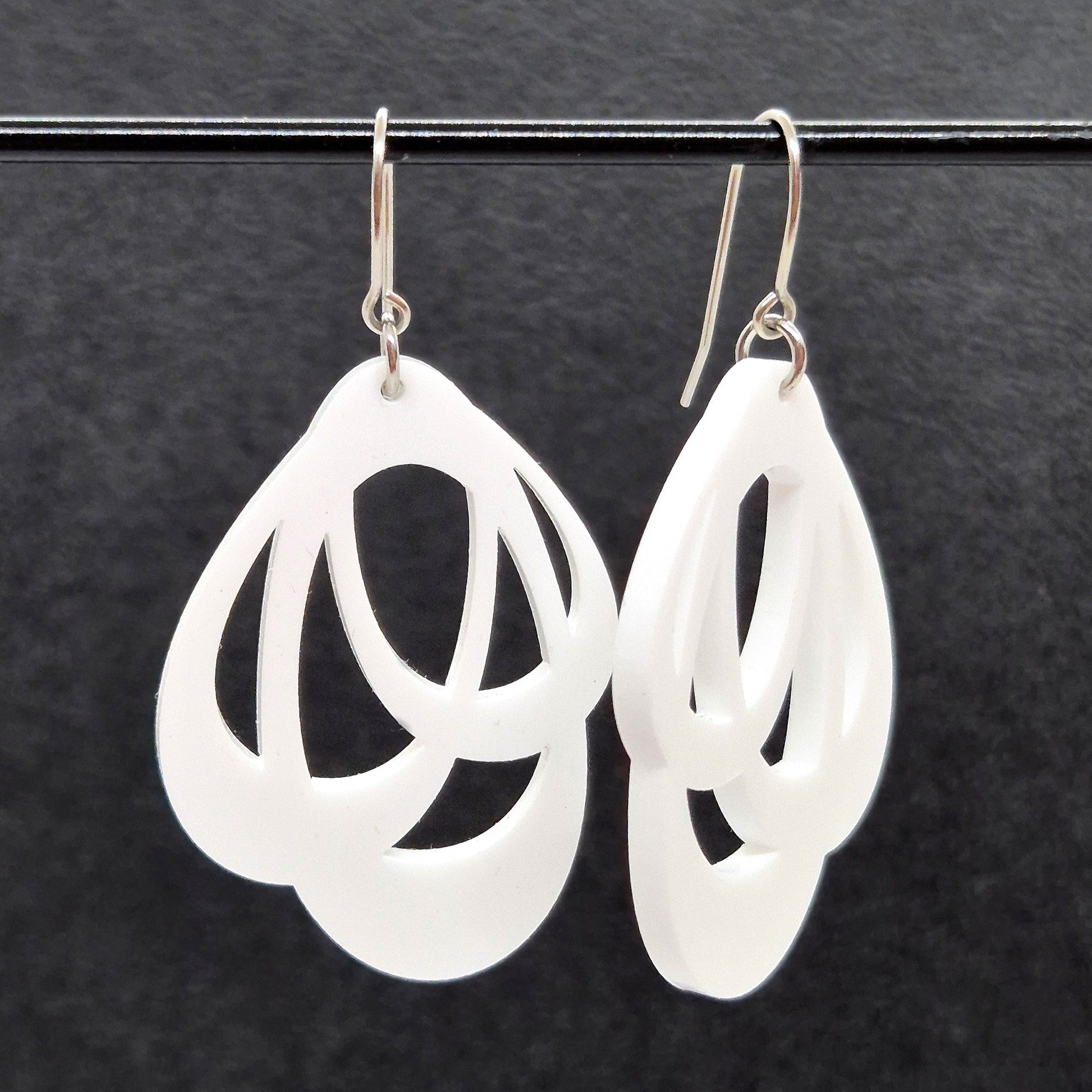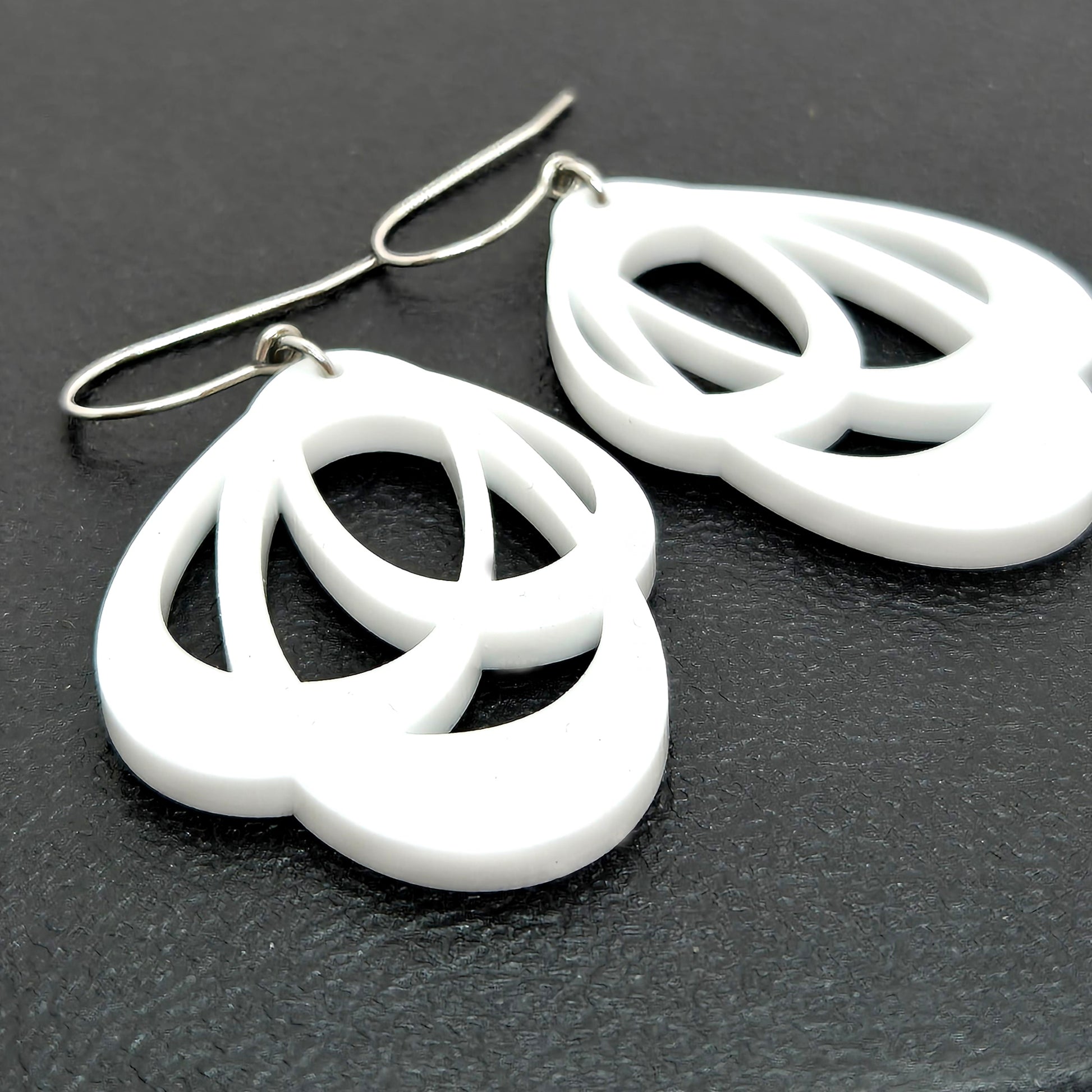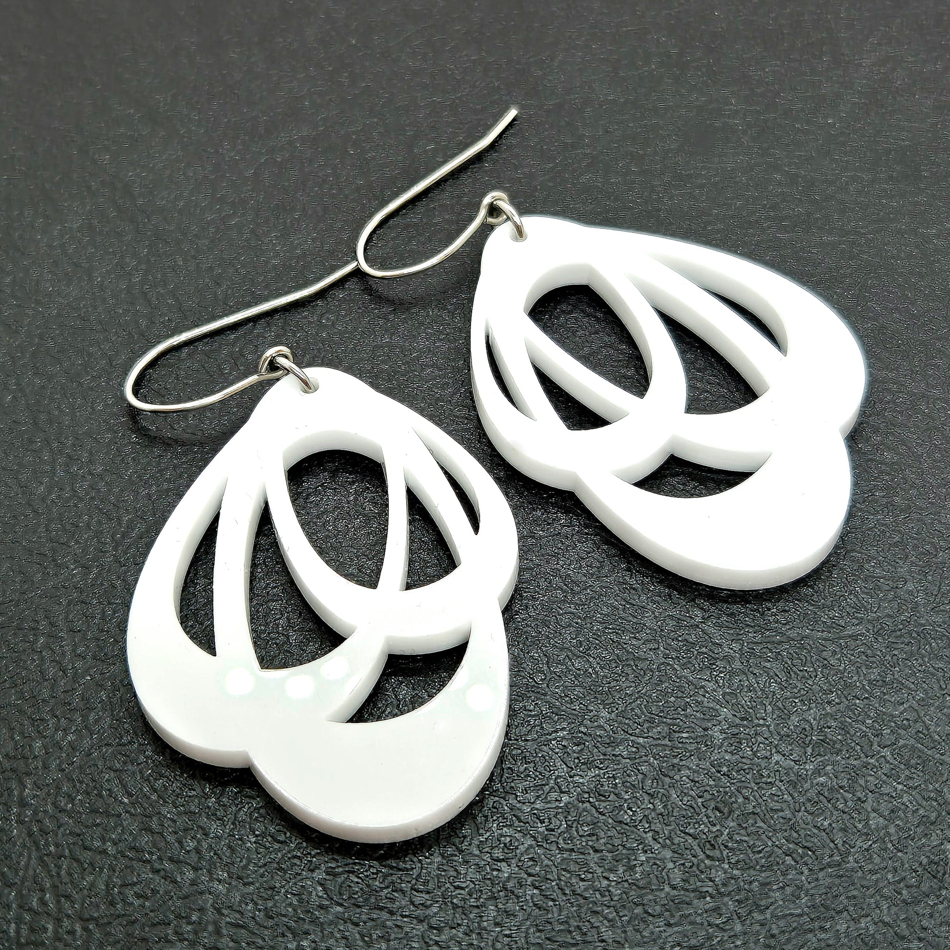 Vita örhängen, med blank yta på både framsida och baksida. Akryl väger nästan inget, så örhänget är lätt och smidigt. Modellen är designad som ett höger- och ett vänsterhänge, för att följa ansiktsformen och hänga bekvämt i ditt öra.